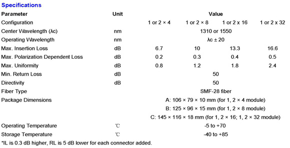 The SMTC Single Mode Tree Couplers offer very low insertion loss, low polarization dependence, well controlled uniformity in a wide wavelength range as excellent enviromental stability. These modules have been extensively used to split and mix optical signals in CATV, LANs and other kinds of optical communication systems.